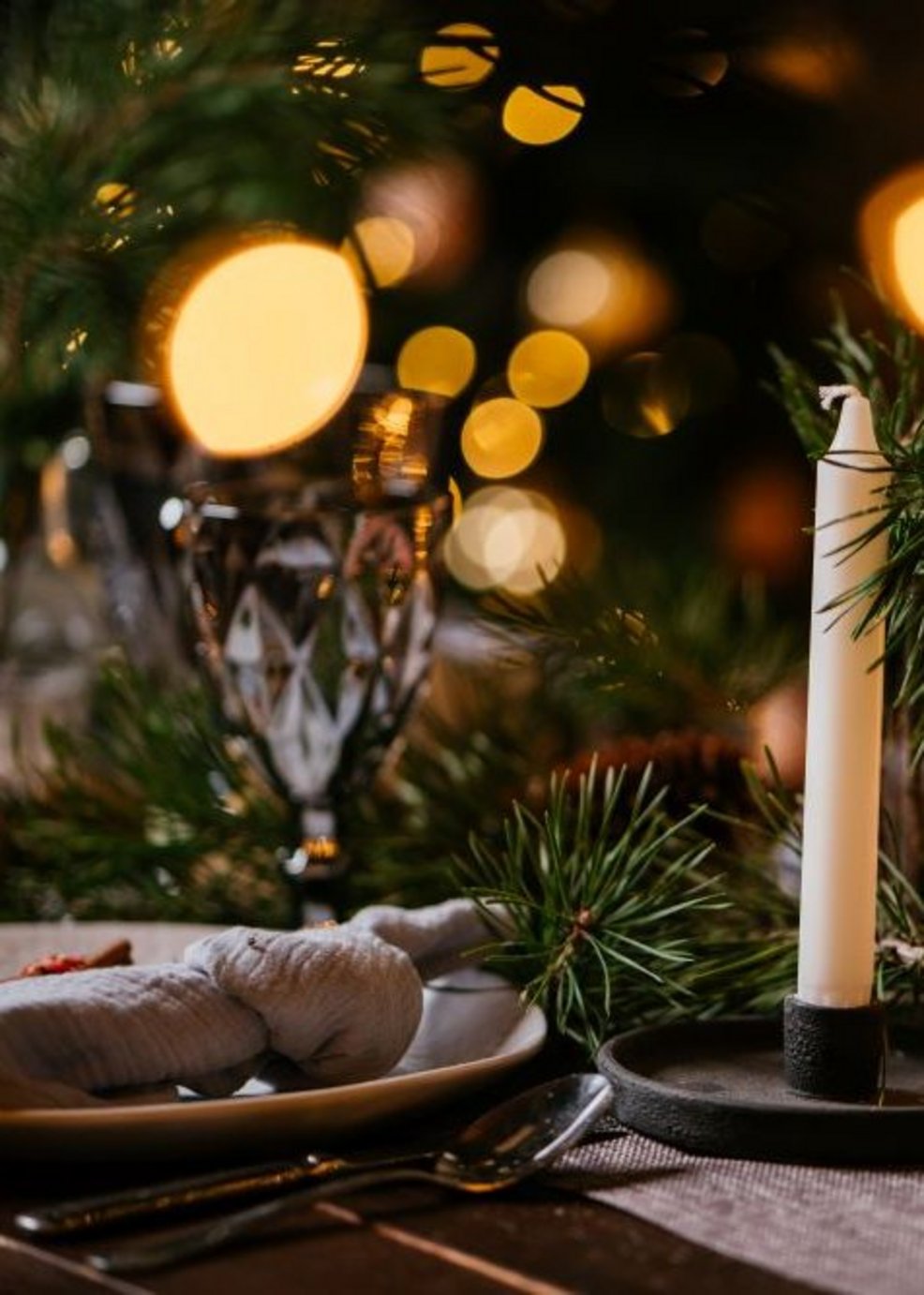 Du sidder ved runde borde sammen med andre gæster, hvilket skaber en varm og social julestemning – perfekt for både par og små familier.